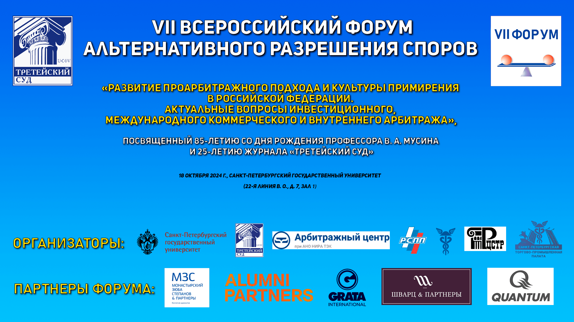 18 октября 2024 года в Санкт-Петербургском государственном университете состоится очередной — VII Всероссийский форум альтернативного разрешения споров «Развитие проарбитражного подхода и культуры примирения в Российской Федерации. Актуальные вопросы инвестиционного, международного коммерческого и внутреннего арбитража».